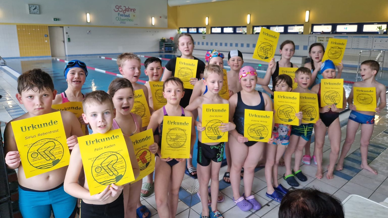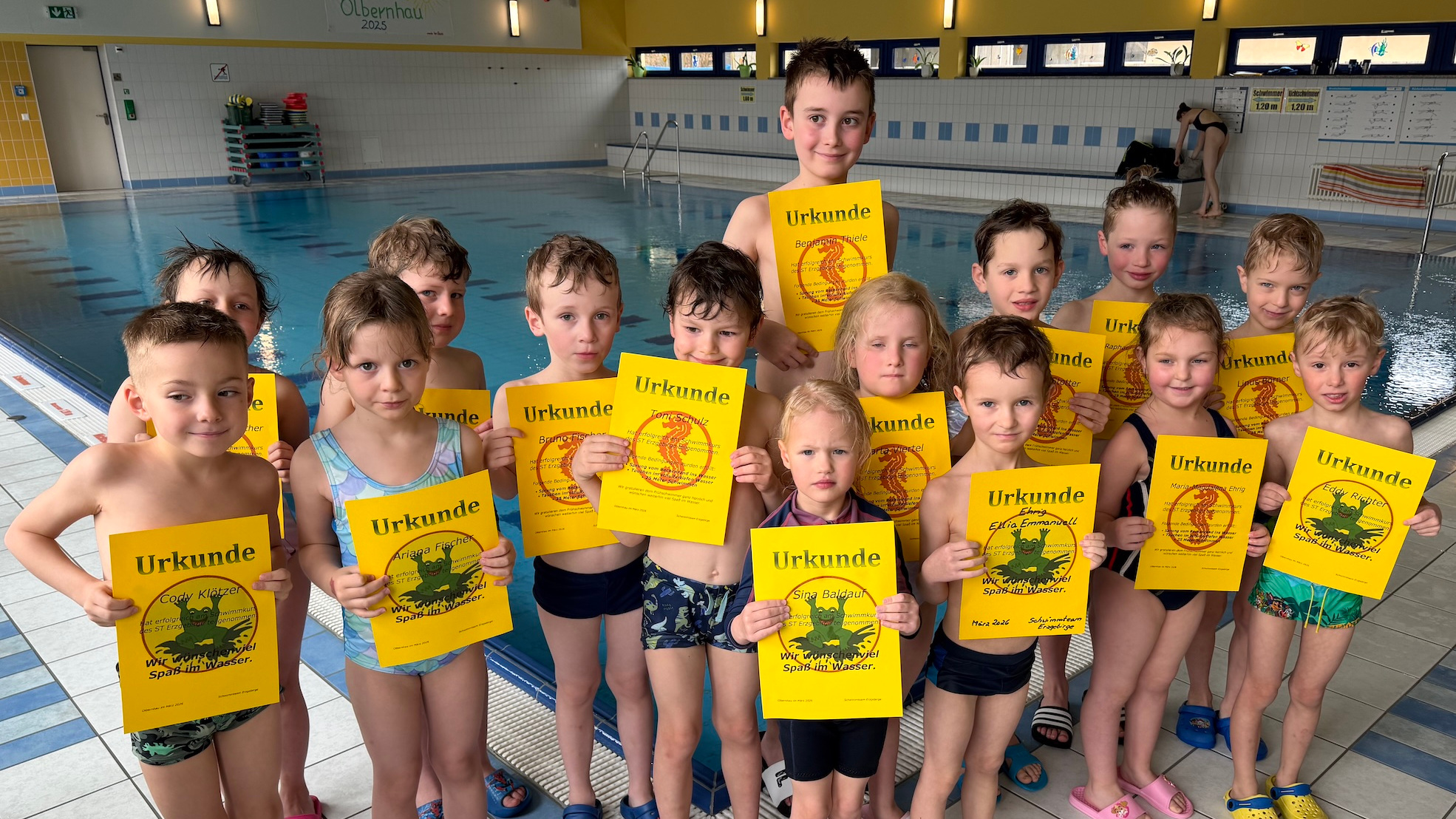 In dieser Woche konnten rund 40 Kinder aus unserem Schwimmteam erfolgreich ihr erstes Schwimmabzeichen – das Frühschwimmerabzeichen „Seepferdchen“ – ablegen. Seit Januar haben die Kinder gemeinsam mit viel Fleiß und Ausdauer trainiert und sich Schritt für Schritt ihrem Ziel genähert. Umso größer ist nun die Freude über den verdienten Erfolg!