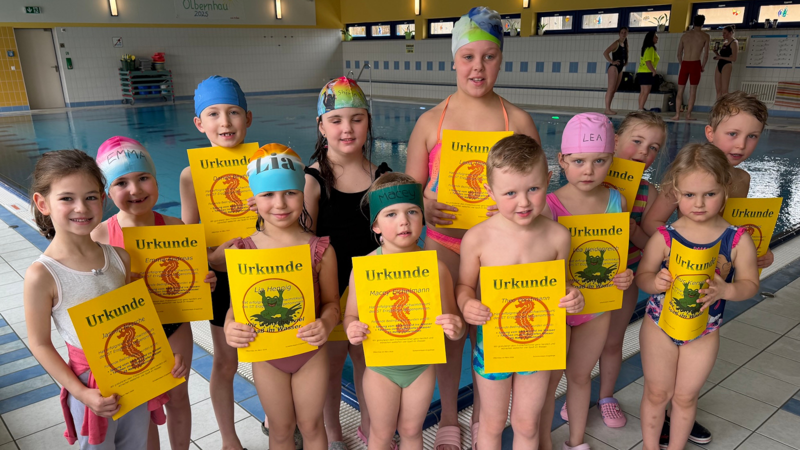 In dieser Woche konnten rund 40 Kinder aus unserem Schwimmteam erfolgreich ihr erstes Schwimmabzeichen – das Frühschwimmerabzeichen „Seepferdchen“ – ablegen. Seit Januar haben die Kinder gemeinsam mit viel Fleiß und Ausdauer trainiert und sich Schritt für Schritt ihrem Ziel genähert. Umso größer ist nun die Freude über den verdienten Erfolg!